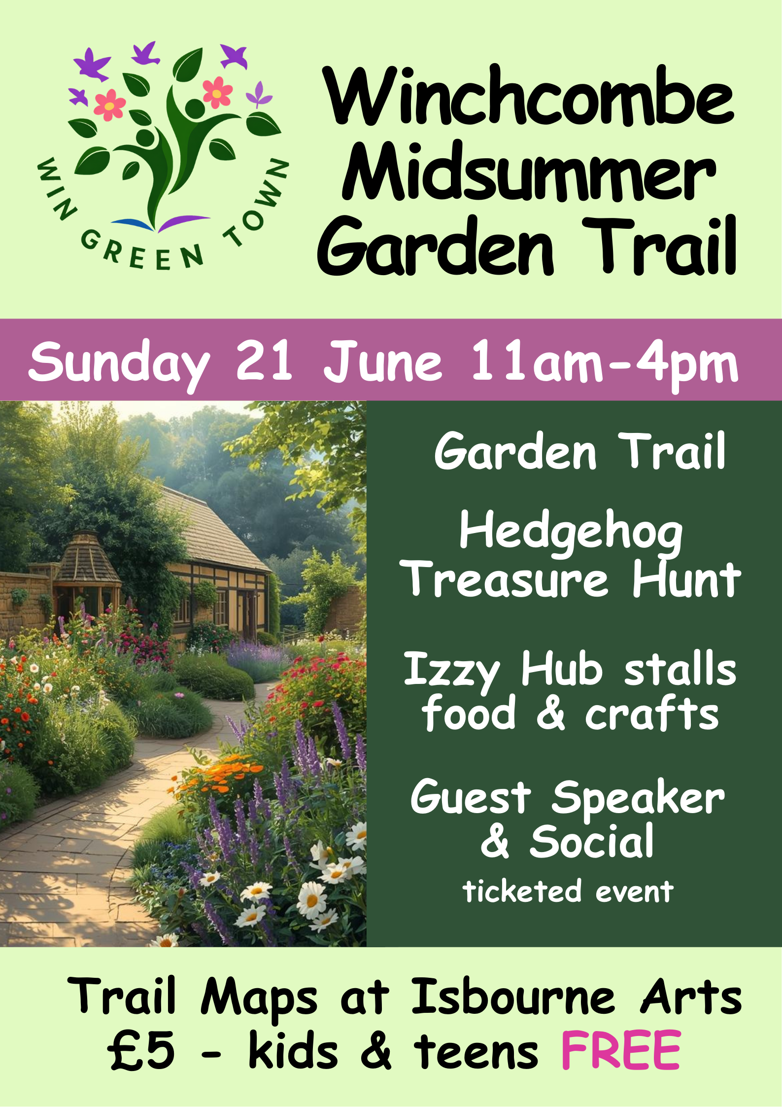 This Midsummer, on Father's Day, come explore the gardens of Winchcombe on our second garden trail. With a focus on helping nature to flourish, there will be a treasure hunt for kids and food and craft stalls all day at the Izzy. Trail maps - £5 - will be available at Isbourne Arts on the day. Keep your garden entry stickers as this gives you half price entry to the evening speaker event too!